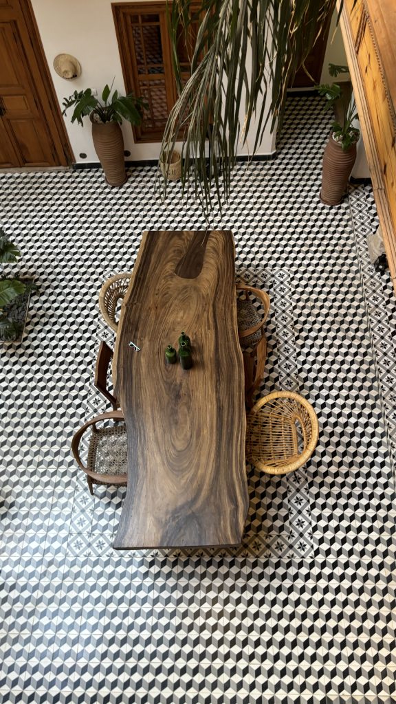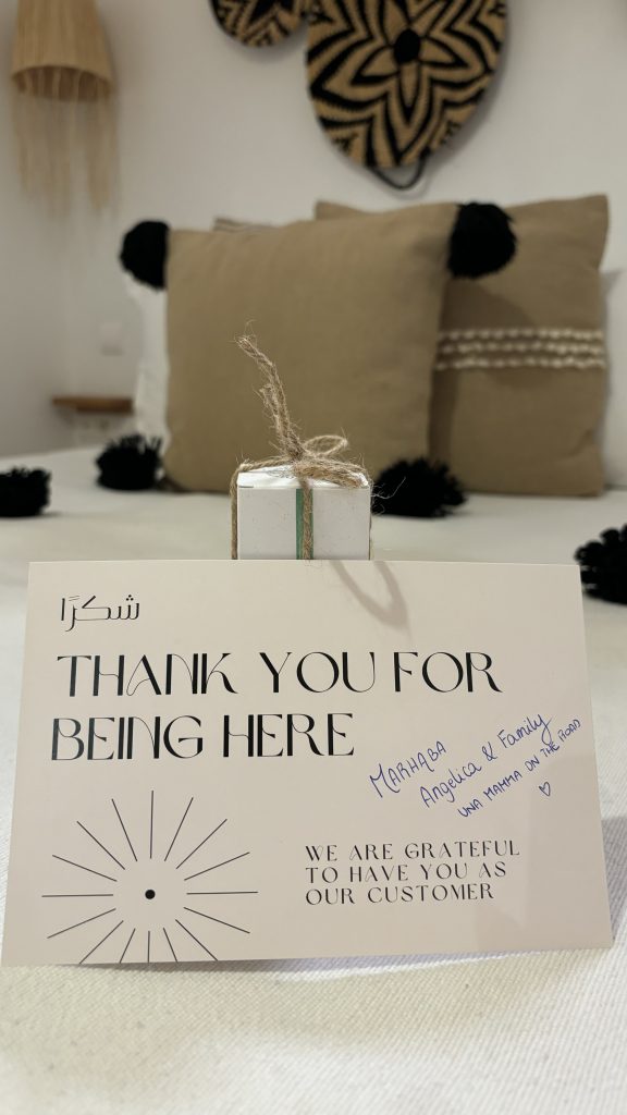 E quando parlo di cura per i dettagli, non mi riferisco solo dell’armoniosità dell’ambiente, ma anche dell’accortezza veso gli ospiti. Quando siamo arrivati Chiara ci ha fatto trovare dei preziosi doni sui nostri letti: album e colori per i bambini, un dolce presente per la cura del corpo per gli adulti. E ancora piu preziosa e l’attenzione del Riad verso l’ambiente: in bagno troverete solo shampoo e bagnoschiuma ricaribabili, in un’ottica plastic-free.