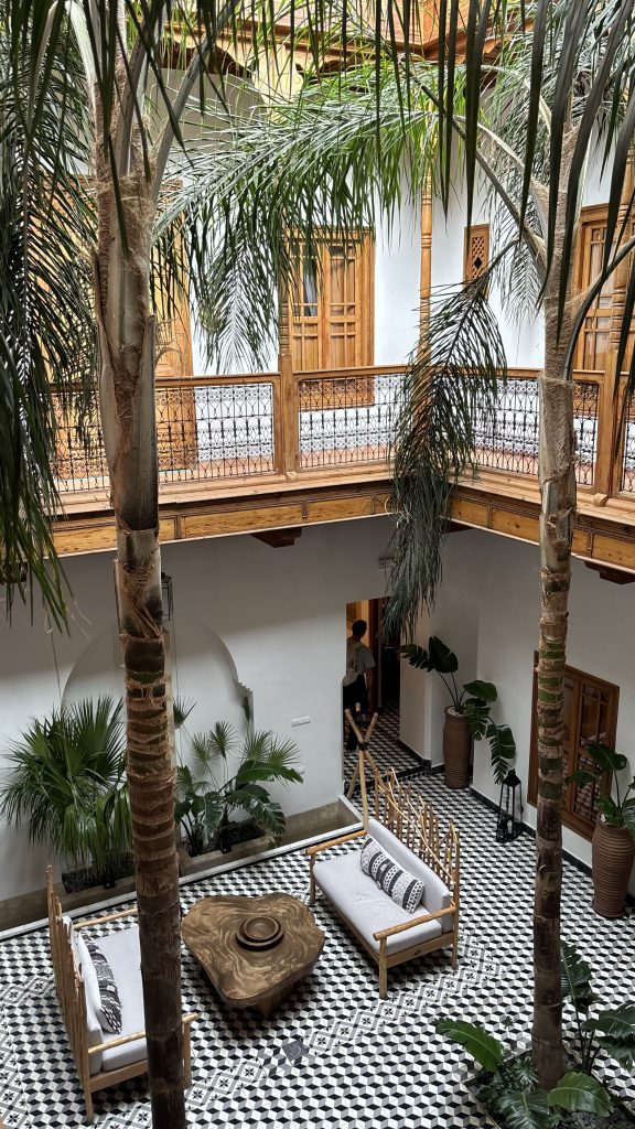Giá da questa prima camminata attraverso le viuzze della medina, tra asinelli, botteghe e profumi di spezie, si inizia a respirare la prima essenza di Marrakech. La vera rivelazione però e aprire quella che sembra una semplice porta. Subito sarete proiettati in un altro mondo, totalmente scollegato dal caos della medina appena lì fuori. Un’oasi di tranquillità e silenzio, tra la vegetazione del giardino interno e l’arredamento tipico, costruito con materiale naturale per preservare l’aspetto originale del luogo.
